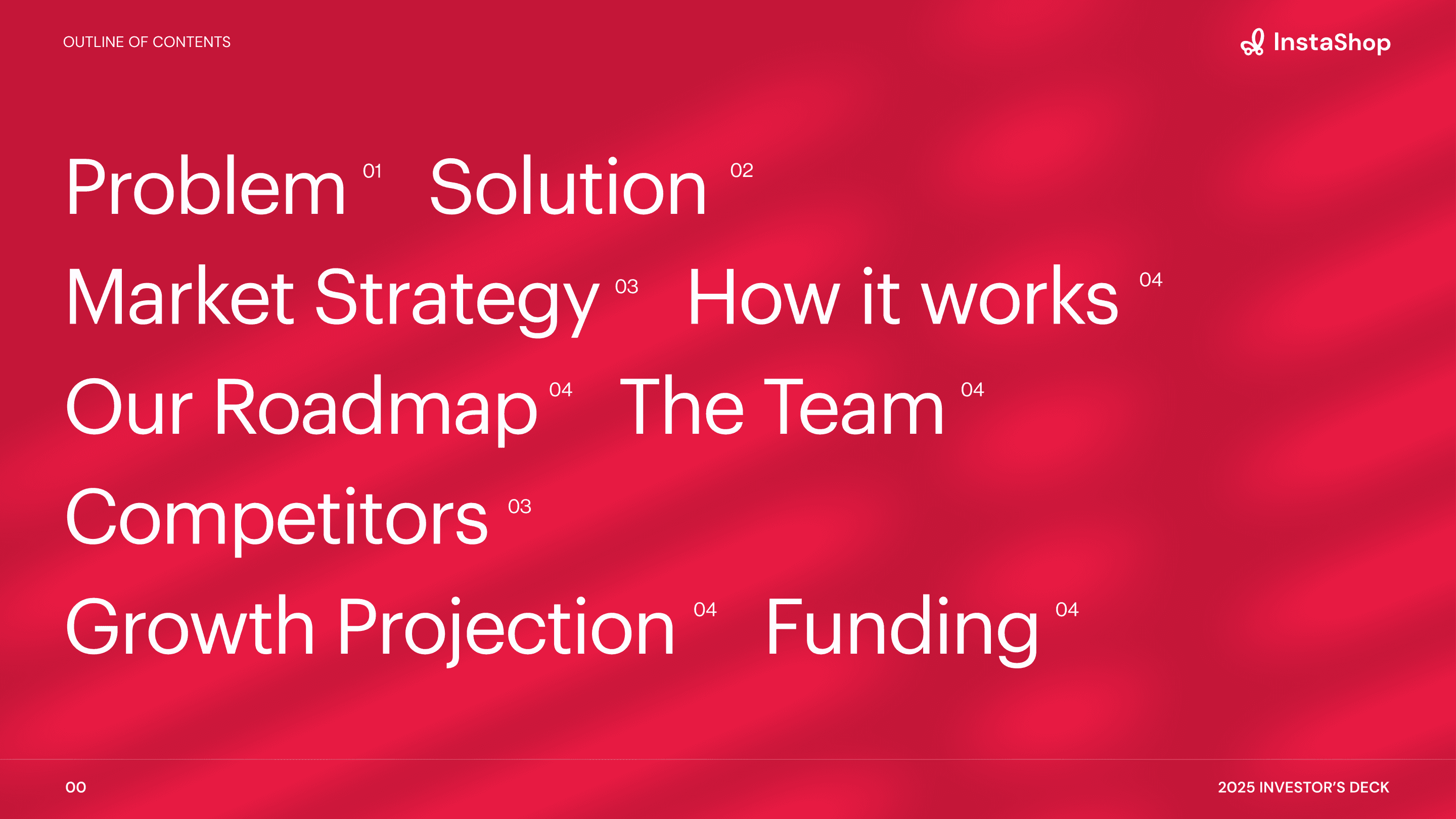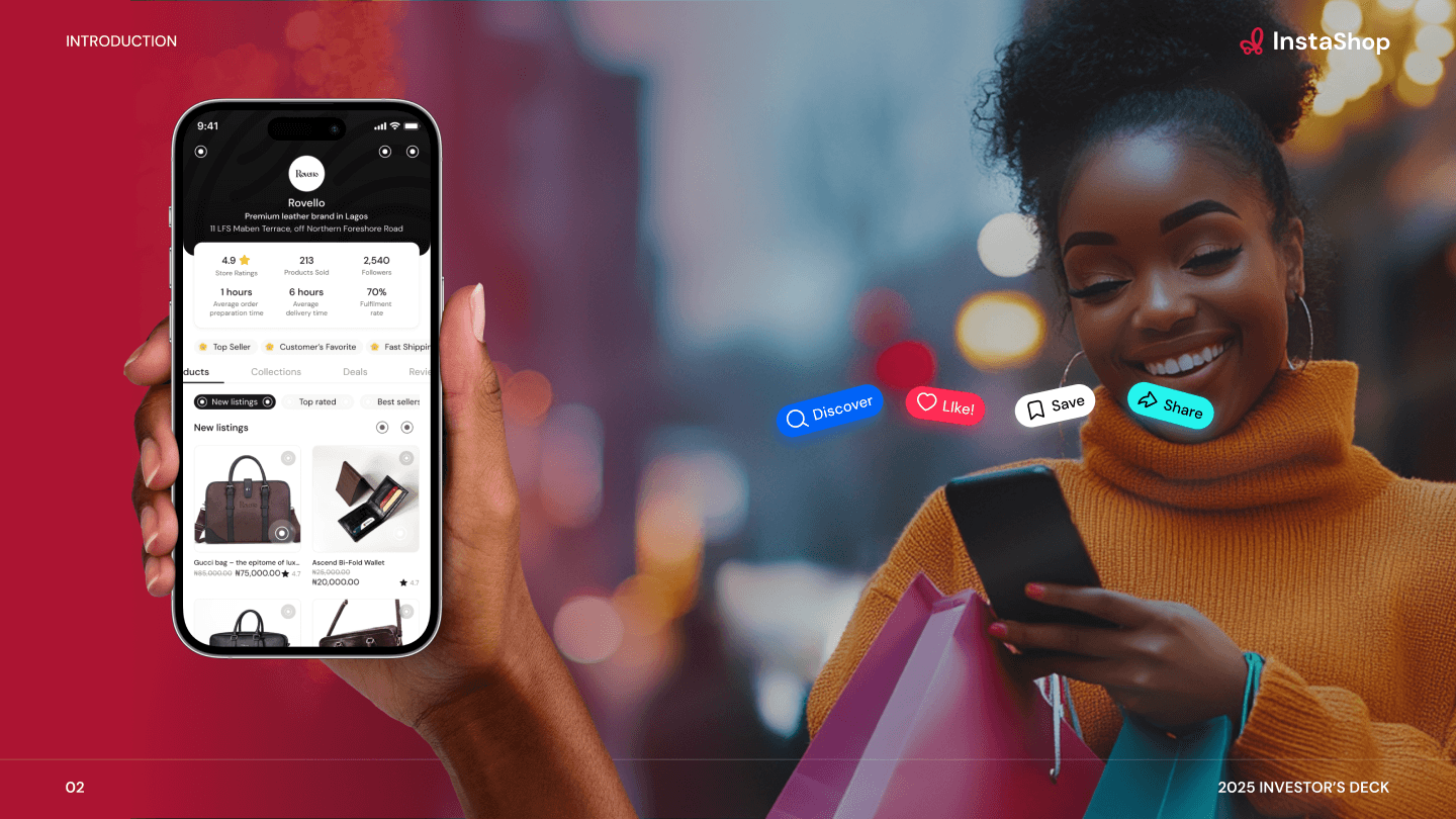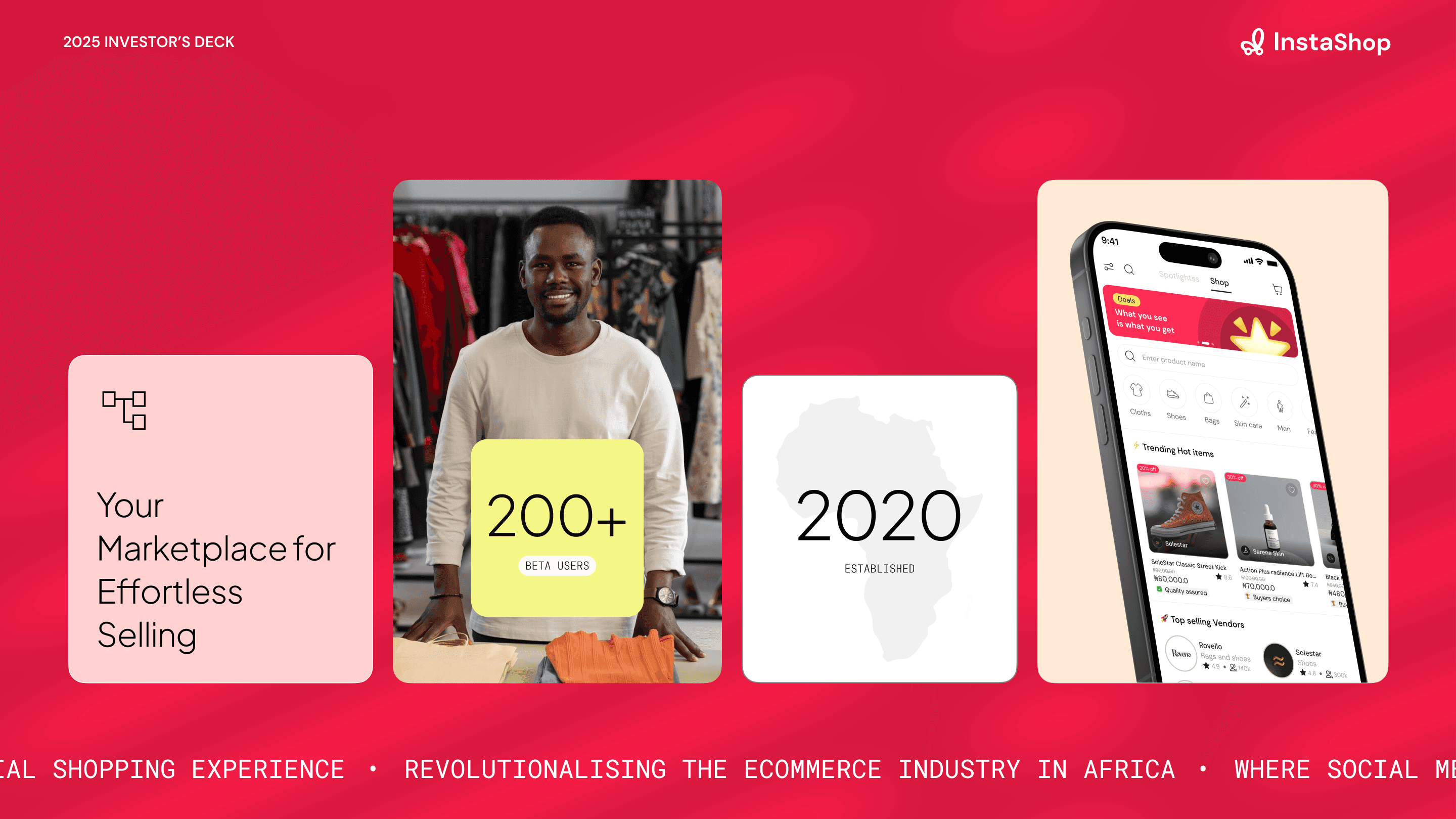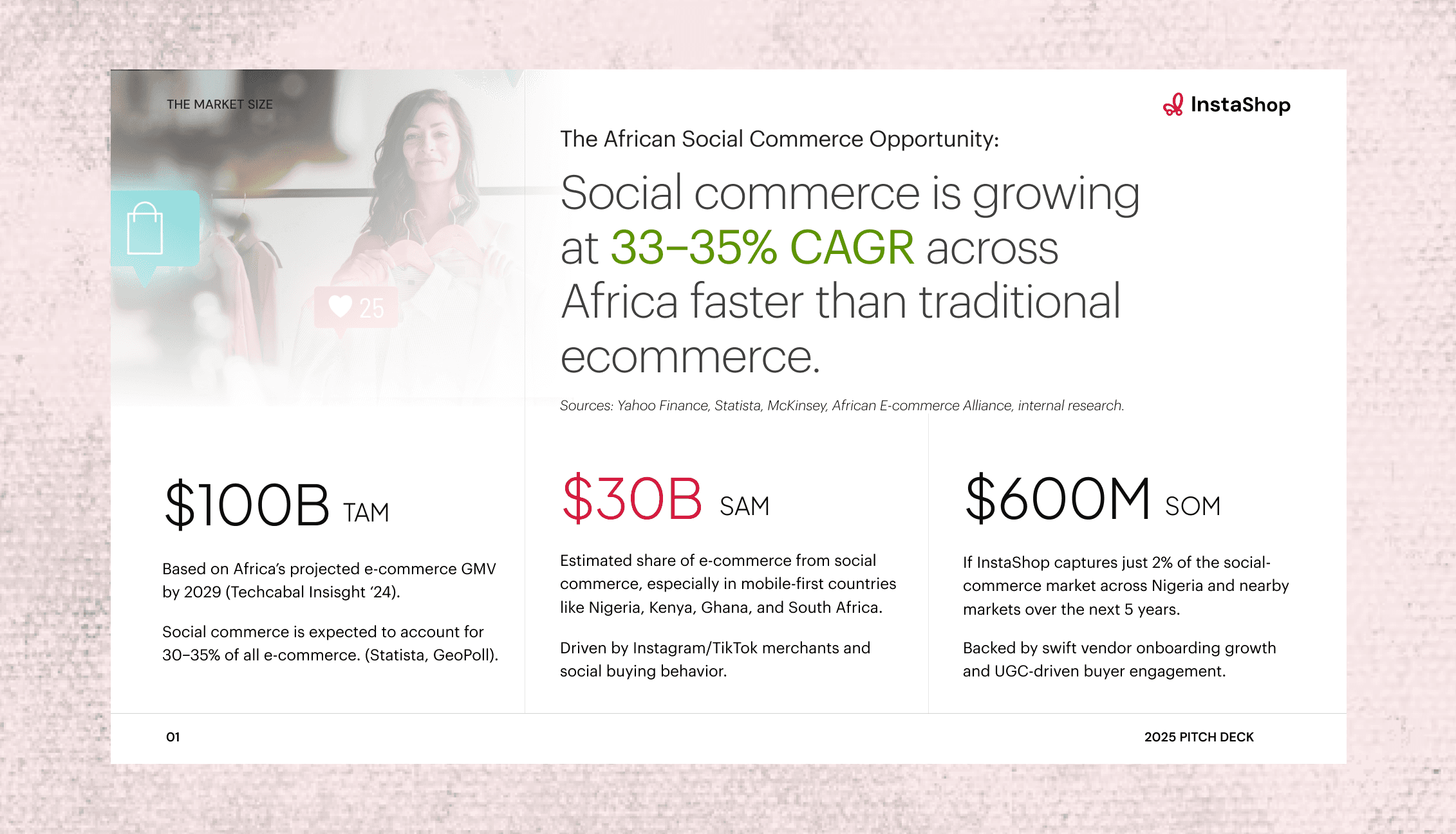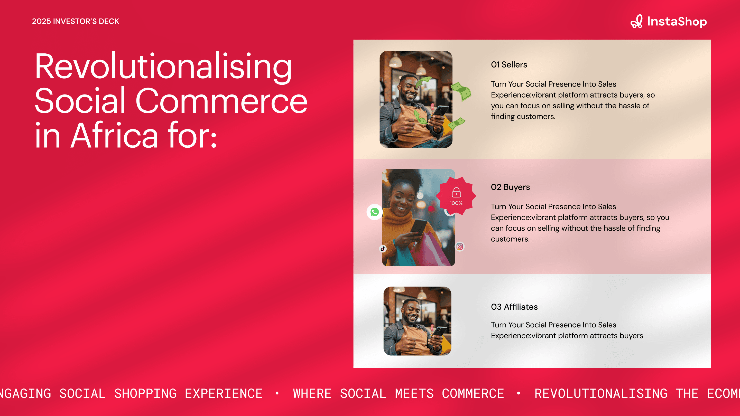 Pitch deck design for InstaShop, a social commerce platform focused on turning social presence into sales across African markets.