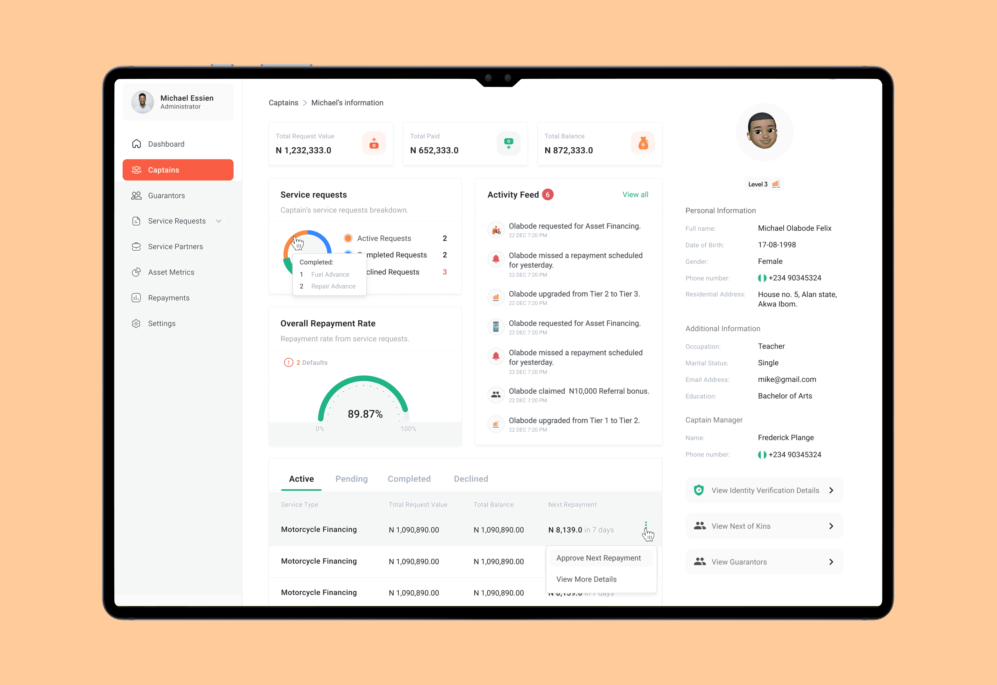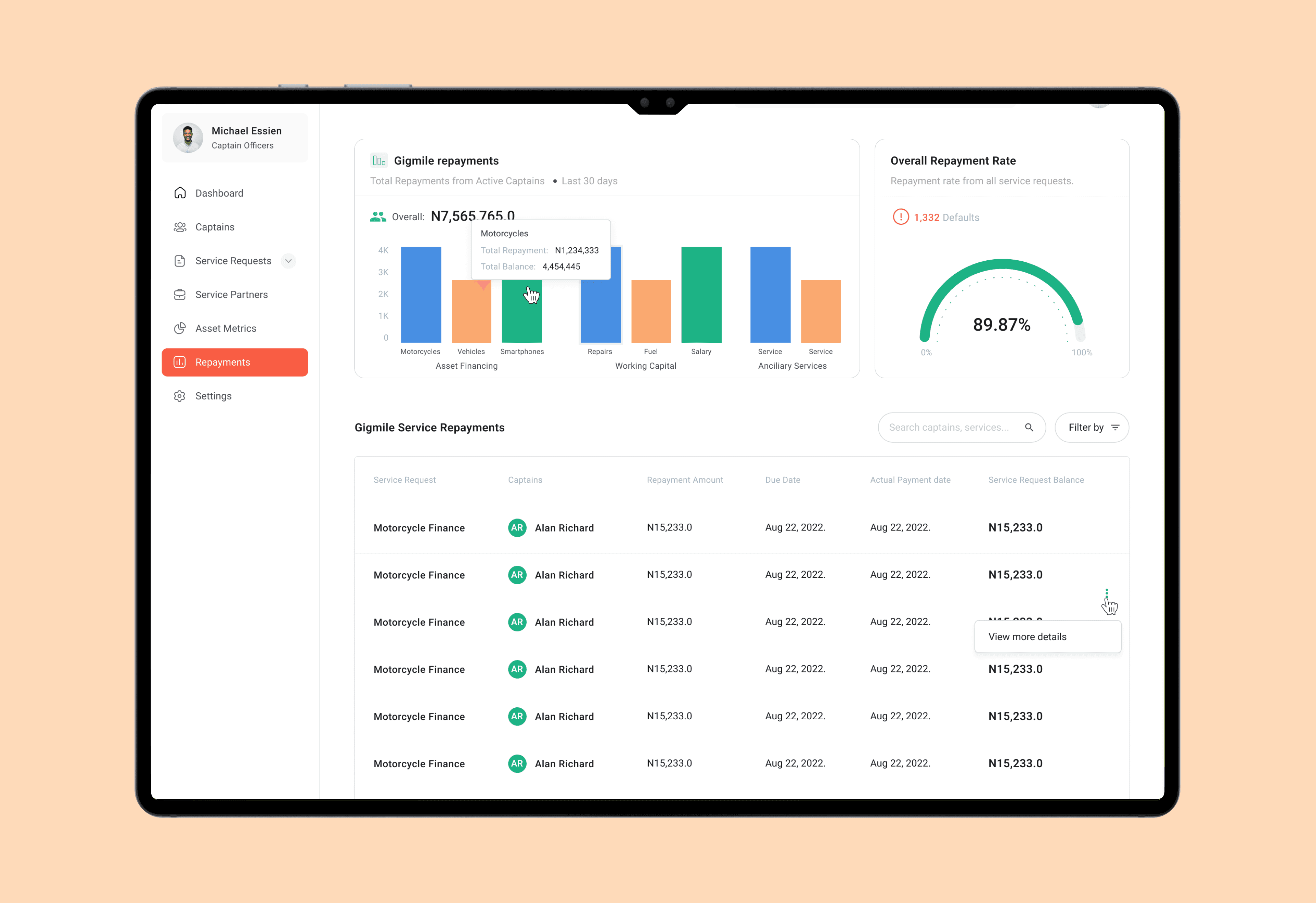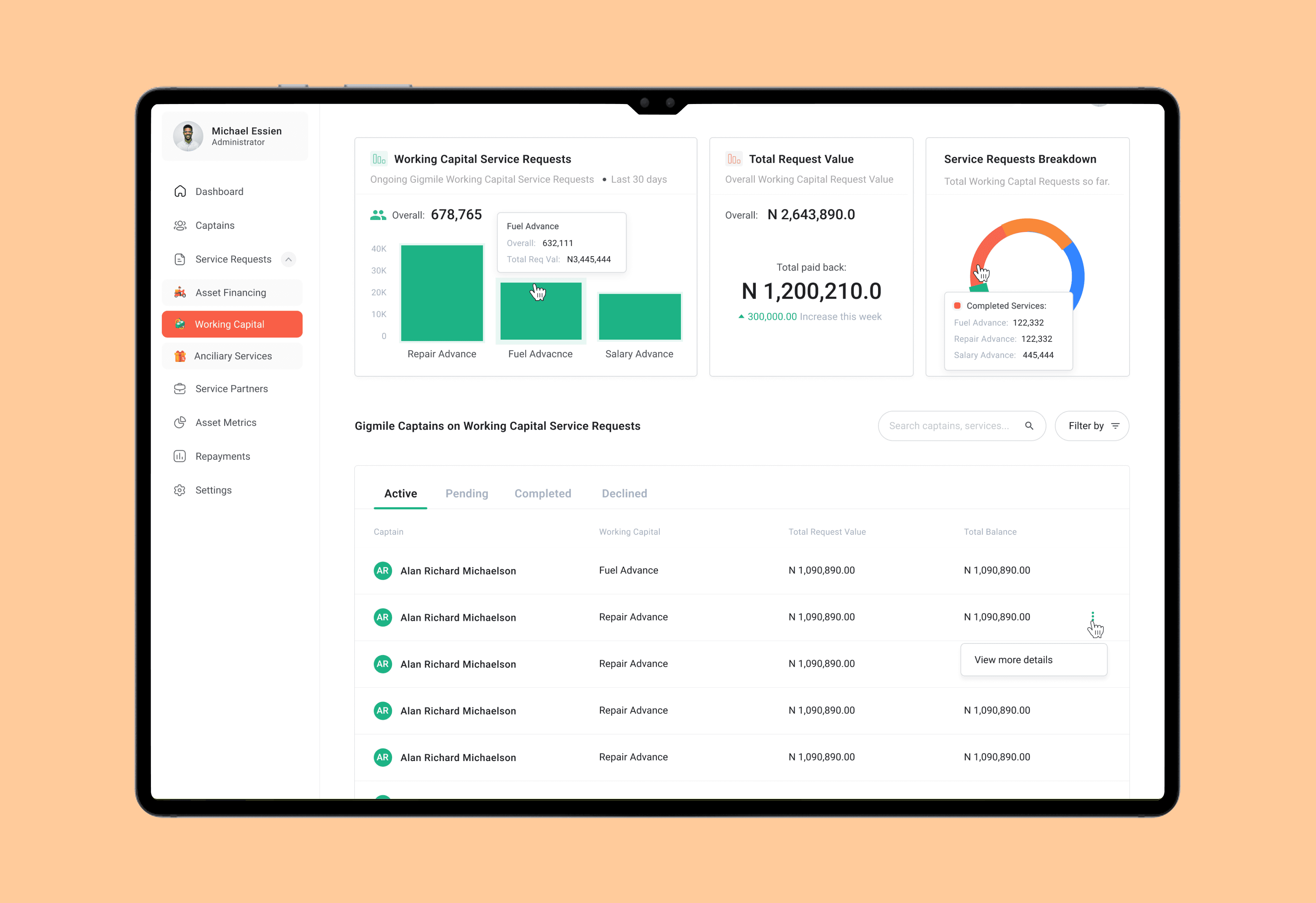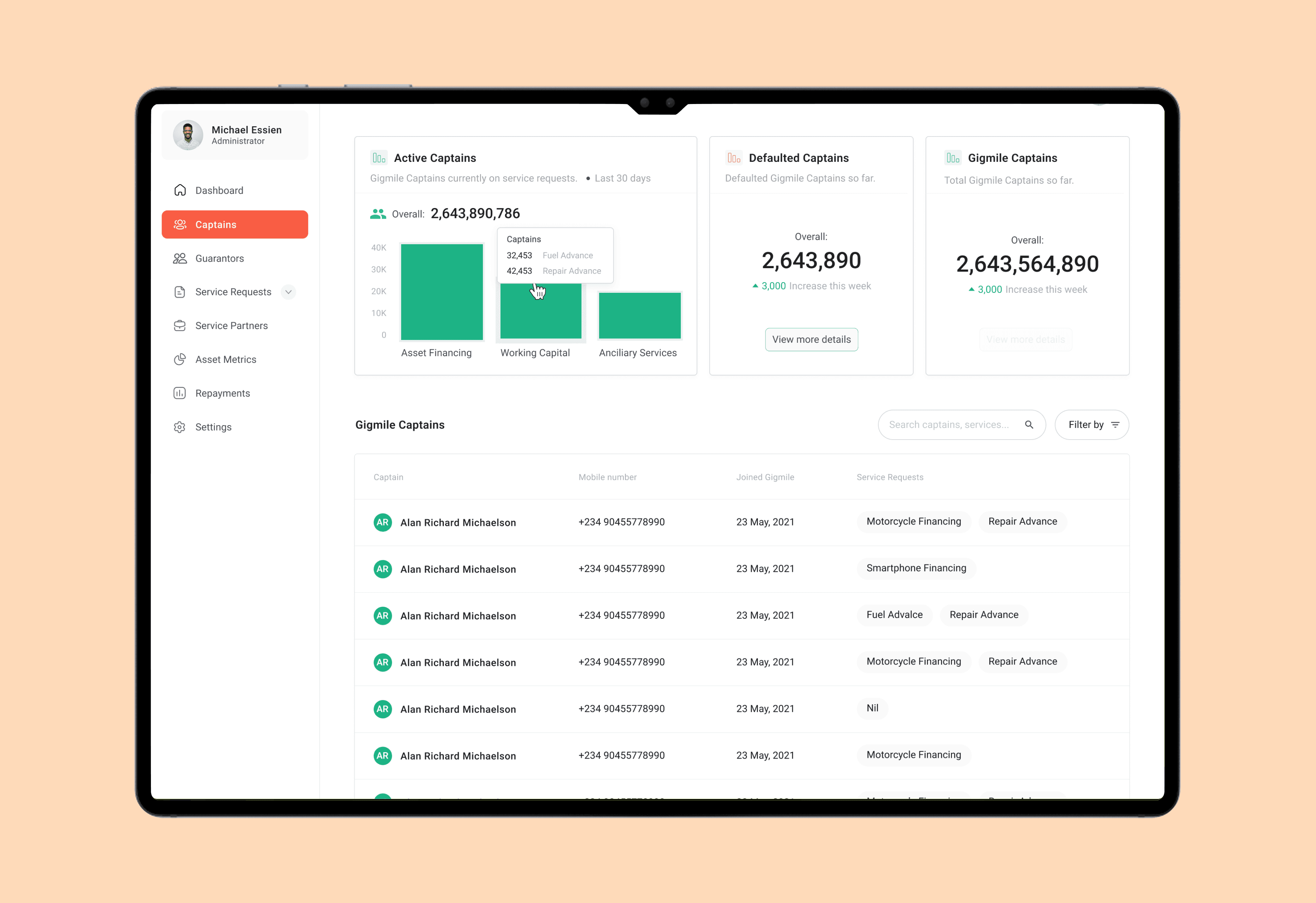 Full captain lifecycle view, Active services, repayment status, defaults, Drill-down into: