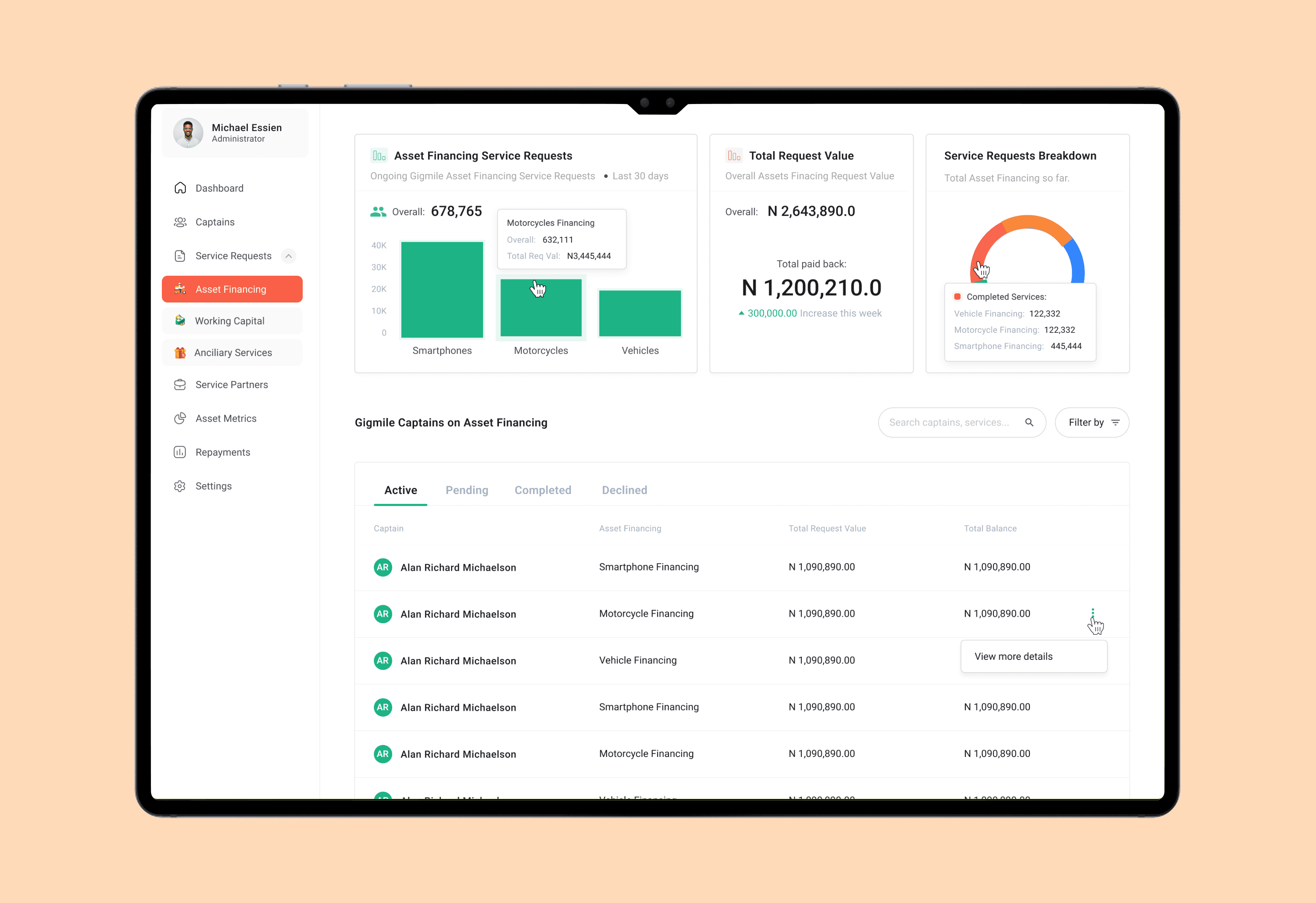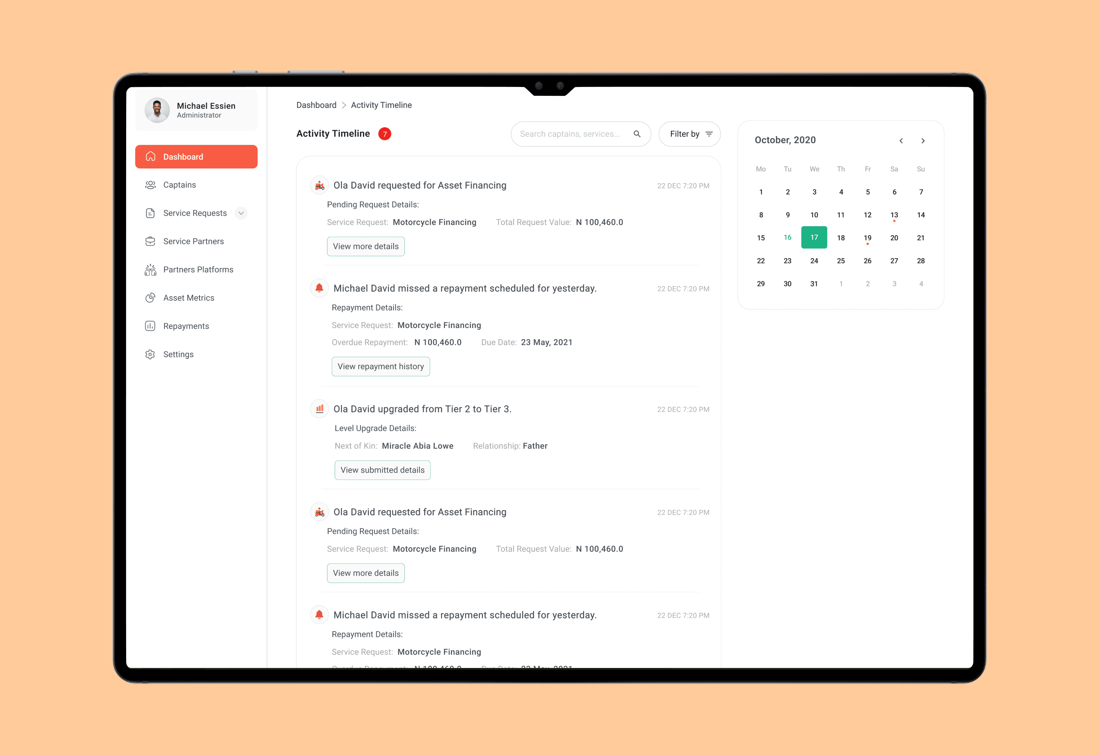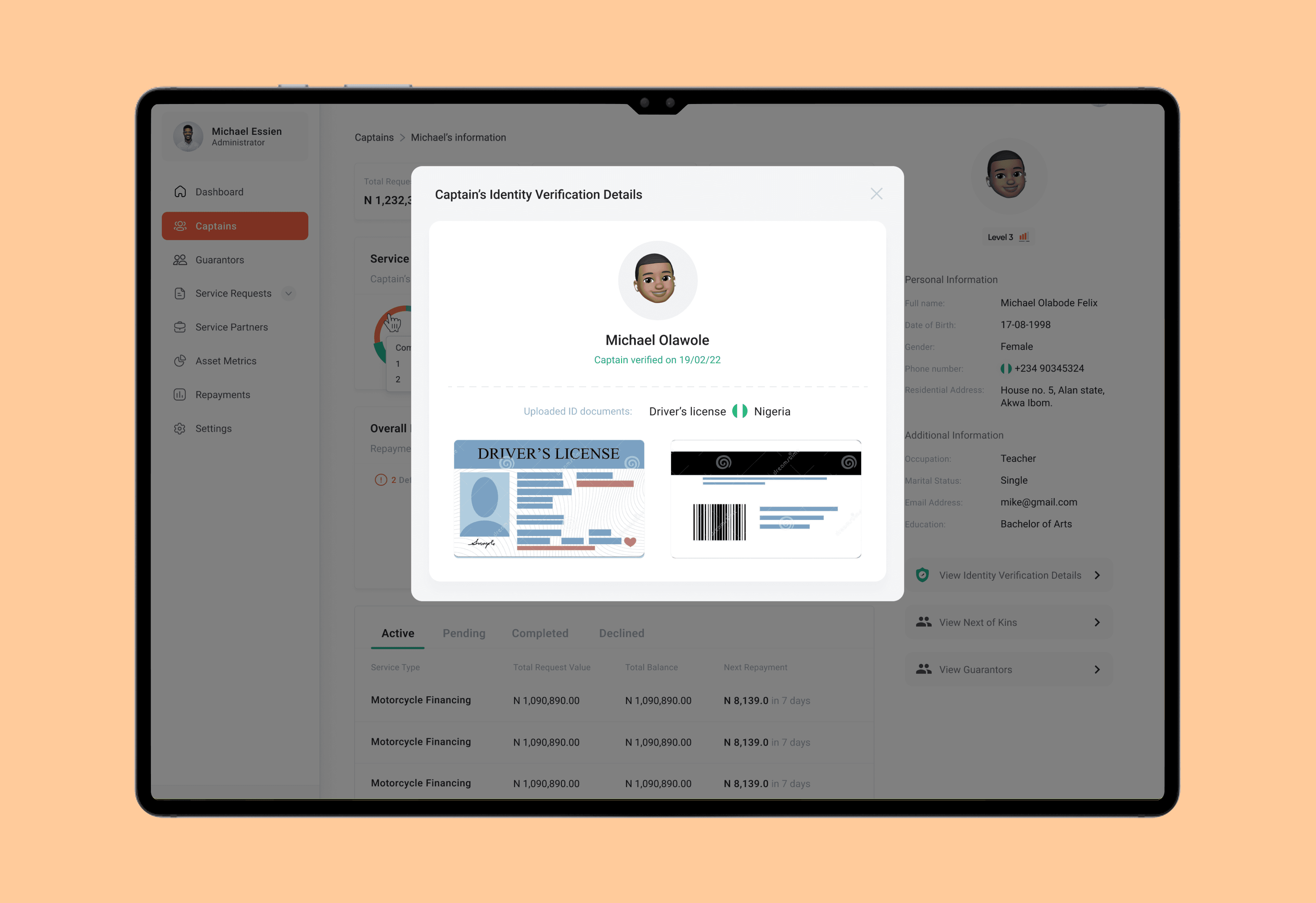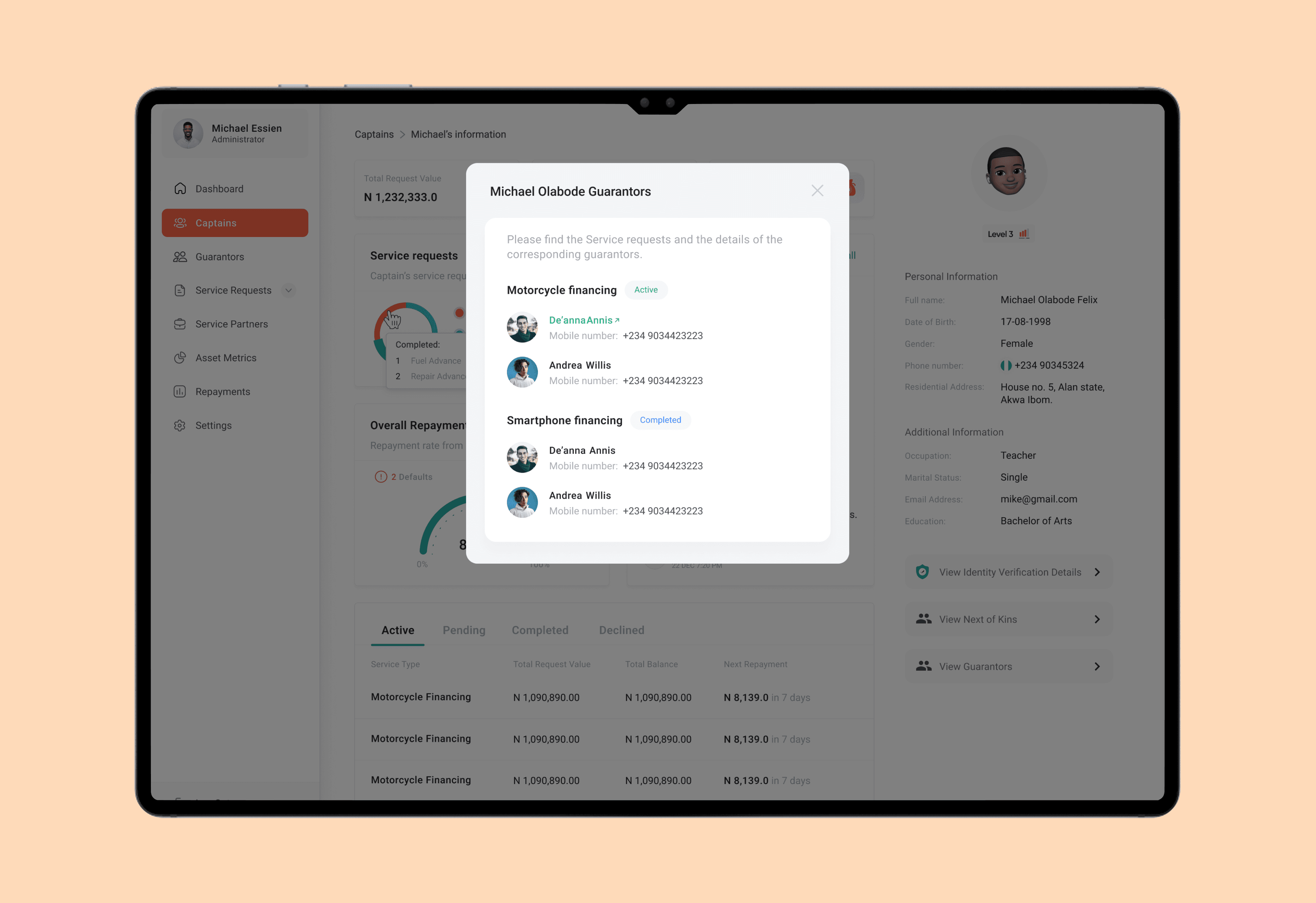 Full captain lifecycle view, Active services, repayment status, defaults, Drill-down into: