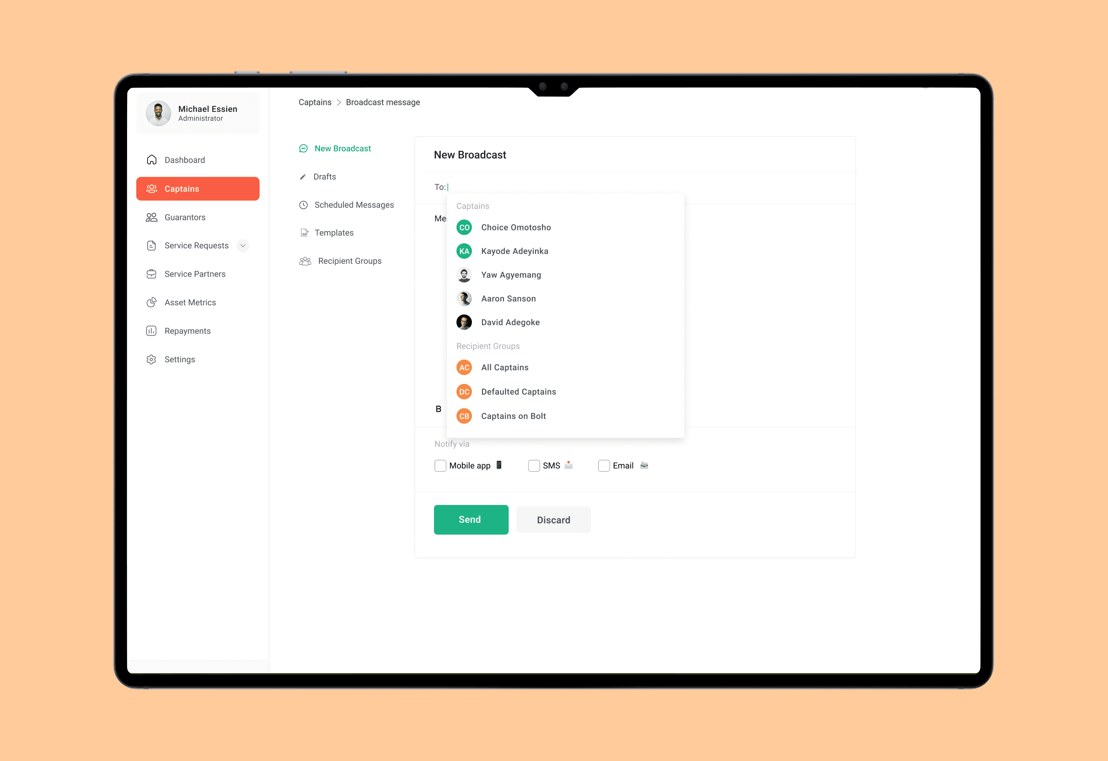 A simple way for admins to communicate updates to captains at scale using targeted messages and reusable templates.