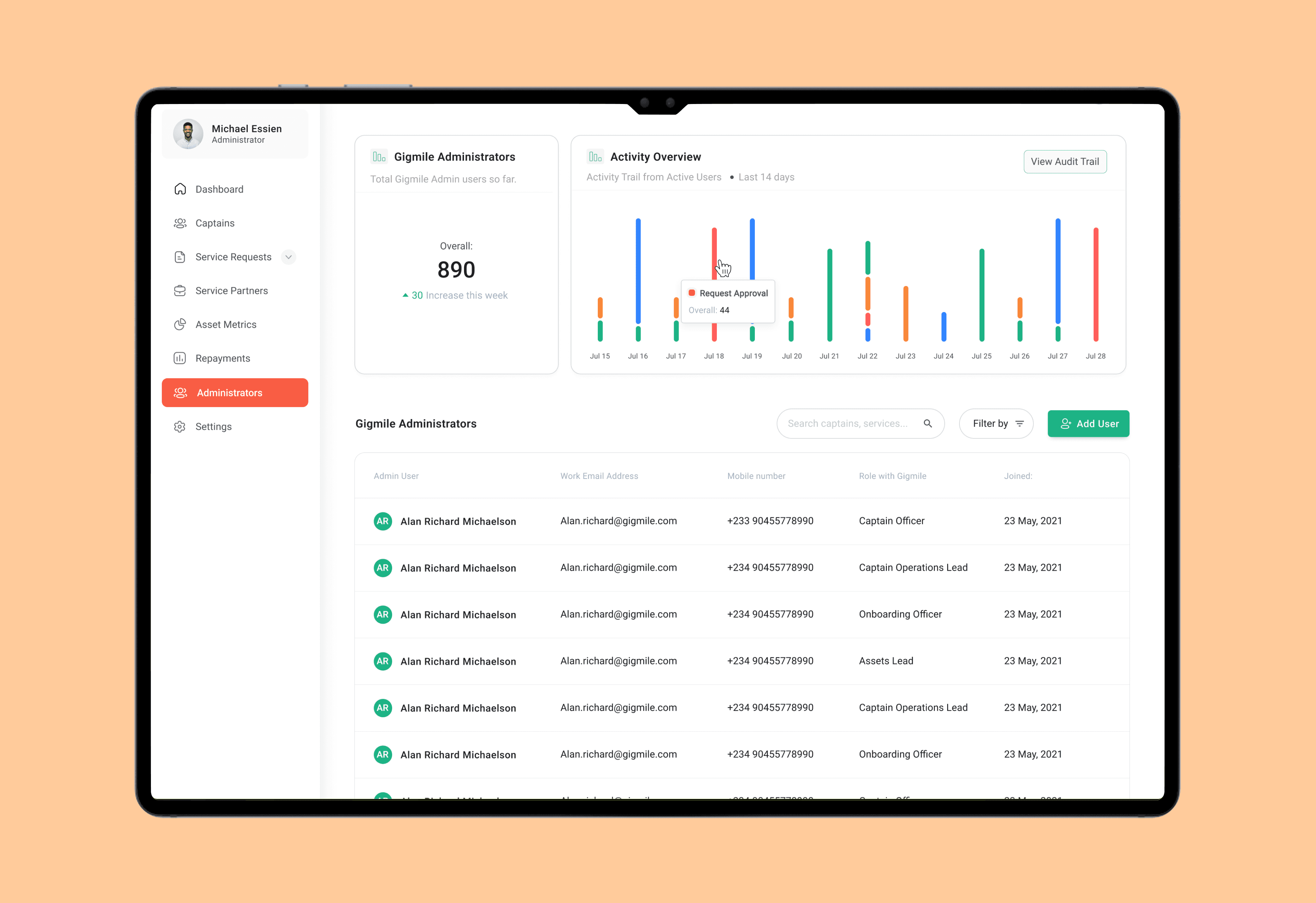 The level of information shown to an admin depends on the specific role, and the metrics were strictly informed by the details the specific admin role tracks in day-to-day operations during fields surveys.