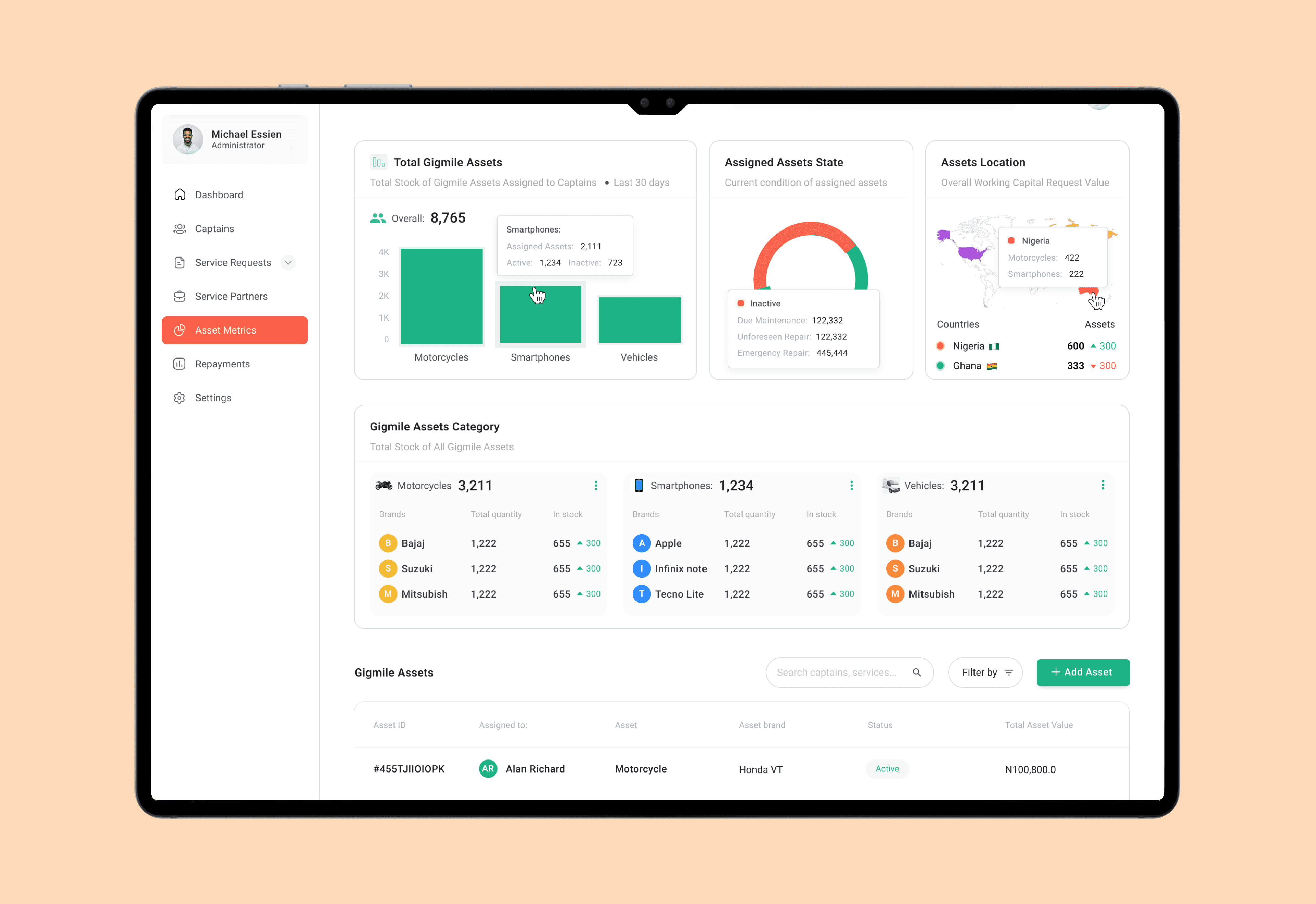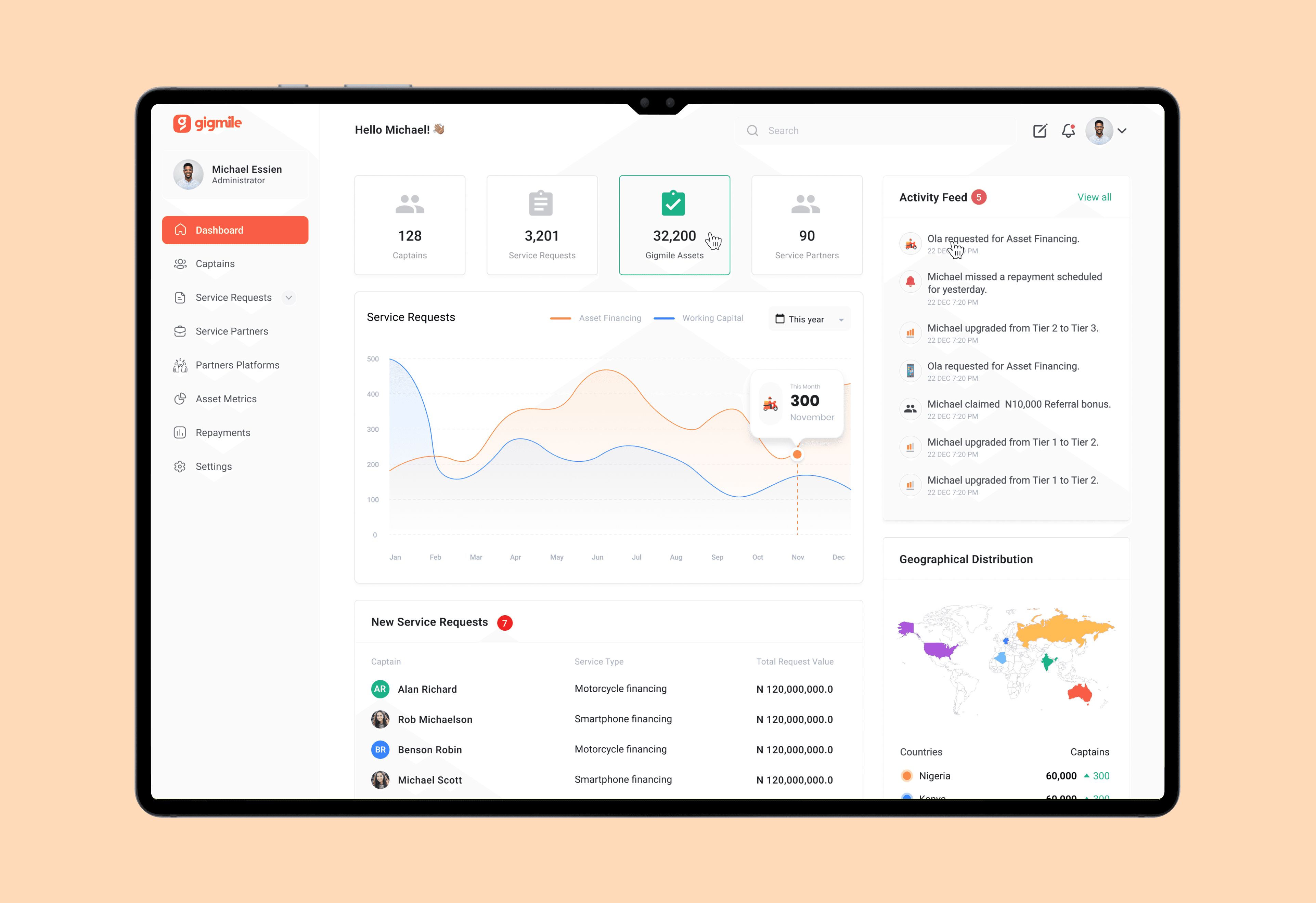 A single source of truth: Active captains, Pending requests, Upcoming repayments, Asset distribution, Geographic activity and Live activity timeline